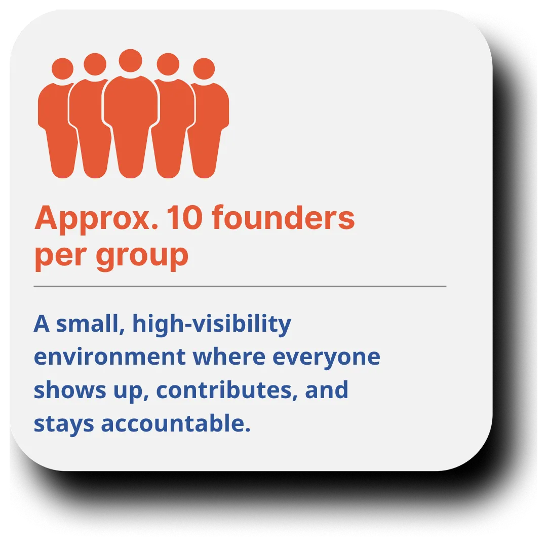 Each Growth Group includes approximately 10 founders, weekly accountability Zoom calls, monthly advisory calls with Rob, custom tools and Scoreboard tracking, and Slack access for ongoing communication and support.