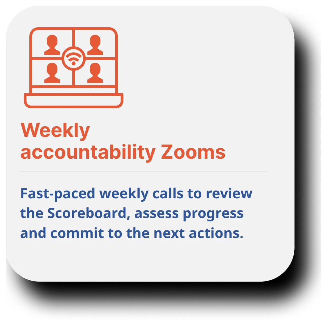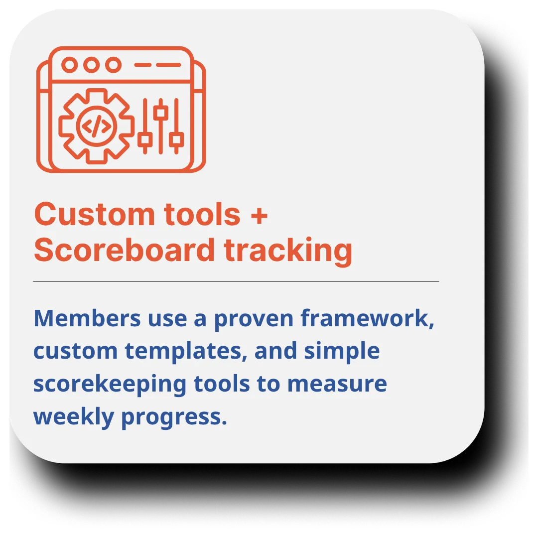 Each quarter members set 90-day Goals, build a clear Scoreboard to measure progress, track weekly metrics, and maintain ongoing accountability to drive consistent execution.
